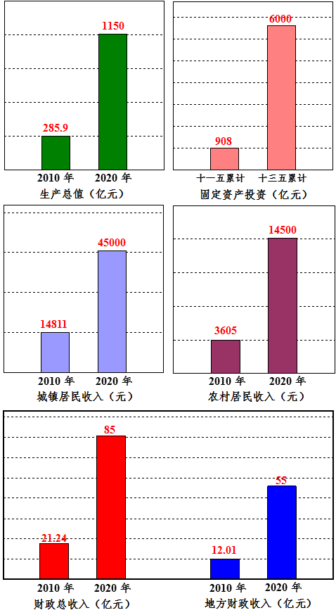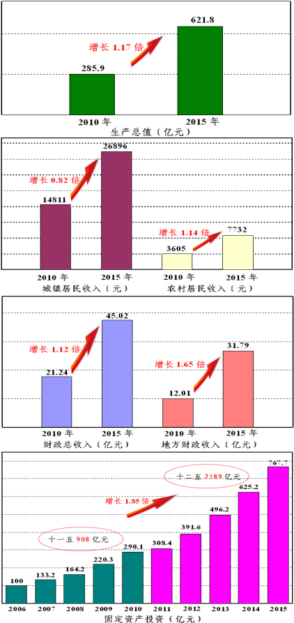 综合实力进一步提升。“十二五”末,生产总值达到621.83亿元,年均增长12.9%;财政总收入和地方财政收入分别达到45.02亿元和31.79亿元,年均增长16.2%和21.5%;城乡居民收入分别达到26896元和7732元,年均增长12.7%和16.5%;全社会固定资产投资五年累计达到2588.97亿元,年均增长26.7%。