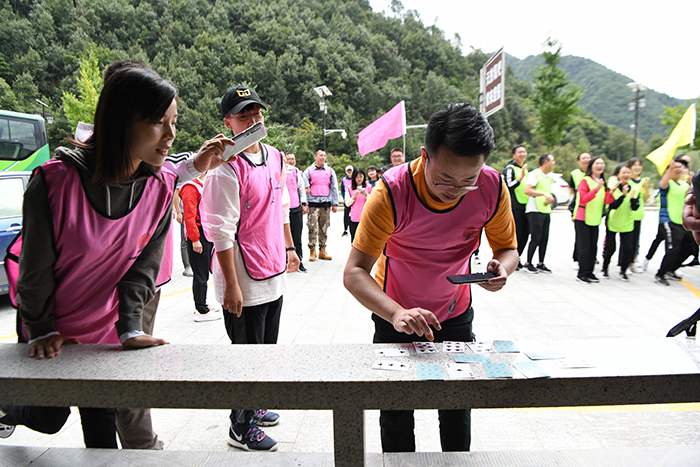 19日上午,全体党员、员工首先乘车来到终南山拓展基地,集体参加了“凝心聚力”拓展训练。53名学员分别组成雲汉队和雄鹰队,两队集思广益,各自形成队名、队旗、口号及队歌并一一展示。在“达芬奇密码”拓展项目中,大家充分发挥团队力量,队友间相互信任、不断尝试、在反复摸索和密切协作下,最终雄鹰队以3比2获胜。充分展现了城投人永不言弃、进无止境的团队精神。