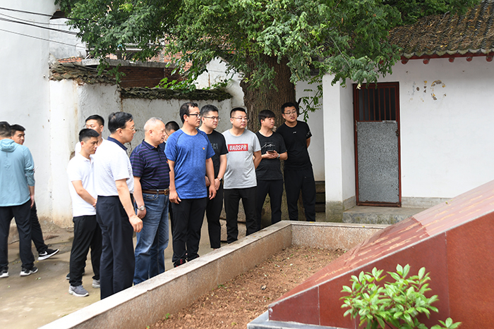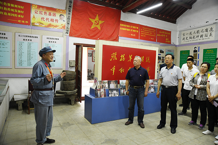 随后,伴着蜿蜒的盘山公路,同志们来到了丹凤县庾岭镇“春茂永”中药铺,也是中共鄂豫皖省委第十八次常委会议旧址,聆听了共产党员杨青山同志的讲解,跟随杨青山同志参观了红二十五军战斗遗址,身临其境的感受了当时红二十五军在庾家河战役中的艰难处境及战士们殊死奋战、不怕牺牲、奋勇当前的英勇精神。庾岭山脊上静默的无名烈士墓、掩藏于树丛中的庾家河战斗纪念亭,以及程子华、徐海东受伤处的纪念碑,这一切都在向每位党员诉说着那段不平凡的岁月。在庾家河战斗纪念碑前,全体党员同志举起右手,庄严宣誓,重温了入党誓词,铿锵有力的声音回响在于家河上空以告慰英灵。