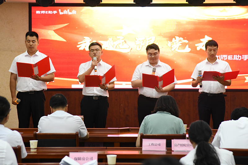 第三项活动,预备党员入党宣誓暨优秀党员表彰活动。由总支副书记、总经理王昱智宣读市国资委党委关于4名预备党员的批复。4名预备党员在总支组织委员南春锋的带领下,面向党旗,高举右拳,庄严宣誓。总支副书记、总经理王昱智宣读了公司党总支关于表彰优秀党员的决定,参加活动的领导向优秀党员颁奖表彰。