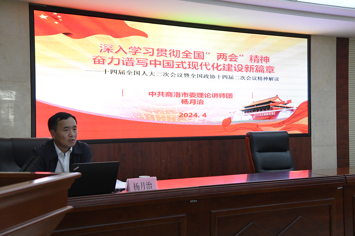 会上,杨月治以《深入学习贯彻全国“两会”精神,积极发展新质生产力,奋力谱写中国式现代化建设新篇章》为题,系统阐述了全国两会的基本情况和会议精神,并围绕市委五届五次全会精神,对市委贯彻落实全国“两会”精神的举措作了详细的解读:一是贯通落实好“五个扎实”“五项要求”“四个着力”等工作要求,完整、准确、全面贯彻新发展理念;二是深化拓展“三个年”活动,打好“四提攻坚战”,实现“六个做示范”,加快打造“一都四区”,奋力谱写商洛高质量发展、现代化建设新篇章;三是全面落实新时代党的建设总要求,持续加强党的政治建设,锻造堪当重任的干部队伍,打造坚强过硬战斗堡垒,以高质量党建引领和保障高质量发展。