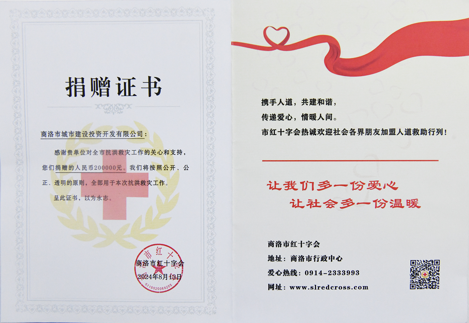 灾情牵动人心,救援迫在眉睫,市城投公司通过商洛市红十字会向灾区捐赠善款20万元,并积极动员公司员工捐赠善款8000余元,用于抗险救灾和灾后重建,全力帮助灾区恢复正常生产生活秩序。