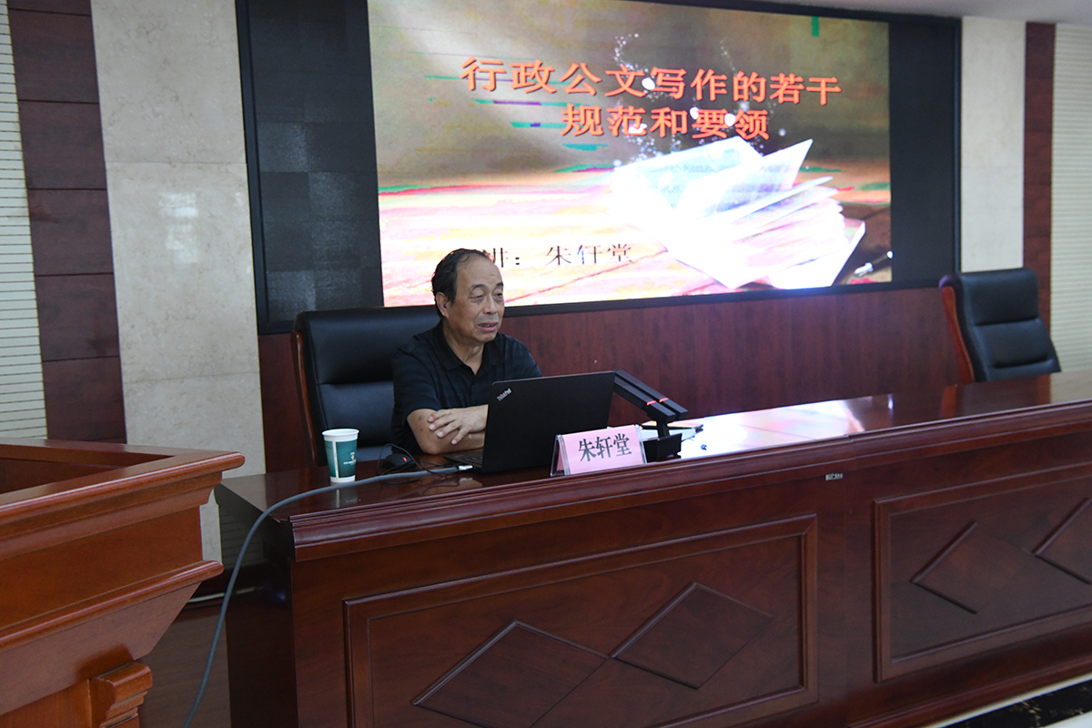 培训会上,朱轩堂同志以简洁的语言风格、扎实的理论知识、丰富的具体案例,围绕行政公文的基本常识、行政公文写作的基本要领、坚定文化自信在“在两个结合”中提高公文写作能力三个方面进行了深入阐述,并结合自身多年的写作经验和工作感触,对公文写作的体例格式、谋篇布局、内容甄选、出彩出新、规避写作误区等核心知识进行解剖式教学,为全体与会人员呈现了一堂兼具指导性与针对性的精彩讲座。