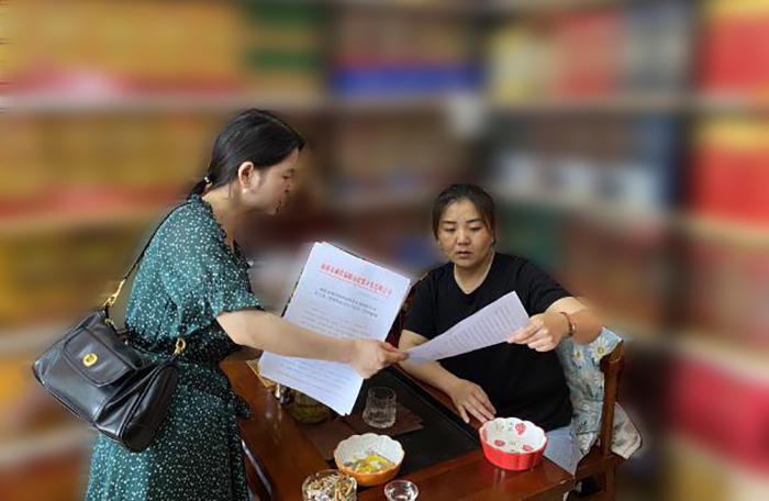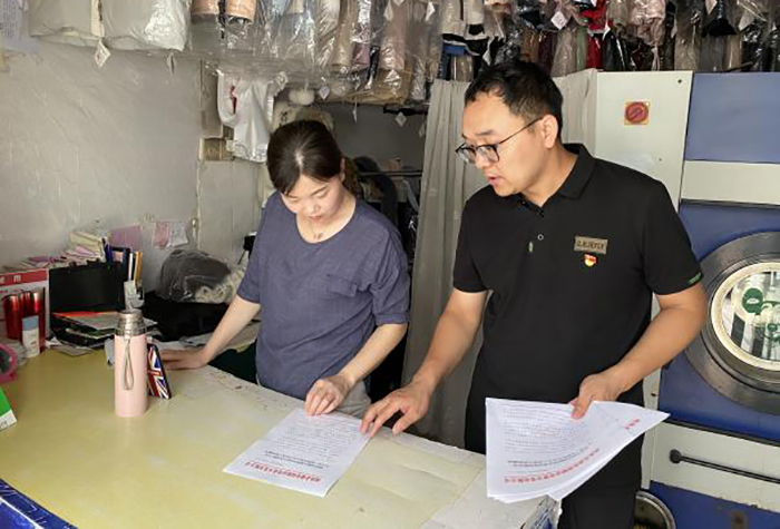 保障房支部书记王斐同志和宣传委员李瑶同志上门为租户们分发《关于进一步做好安全生产经营工作的通知》,叮嘱每户务必配备灭火器,对接触不良、老化的线路、超负荷的电器及时更换,对设计餐饮的租户必须定期检查煤气罐、灶、软管是否完好,严格落实用火、用电、用油、用气的防火安全管理制度。
