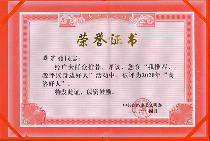 辛旷怡同志被评为2020年第一季度“商洛好人”
